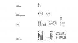Internally, houses with four different types of the living room are proposed. First, it is a compact-sized apartment without a living room for 1-2 people. Next, the living room can be combined or divided and has dual functions. Third, the living room is far away from the center, so individual privacy is protected. Lastly, an expanded number of living rooms plays various roles such as guest reception room, hobby room, family gathering room, and tea-drinking space.