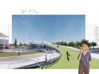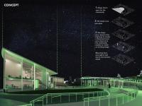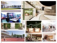 At night, the whole aesthetic of the building changes from an open and family-oriented space to a vibrant one with the help of the neon lights. The light adds and promotes a kinetic feel to the place. There is more focus on the sport section of the project that will ultimately attract athletes or anyone who would want to practice fitness activities. The project has two parts. The first part is community-oriented, and the other part is sport-oriented. The center of the project acts as a transitioning area that creates a balance between the two zones and merges both functionalities together. The landscape was created to focus on the main entrances and to pave the pathways. The pathways have been designed in a way that it won't intervene with the project's building and masses. The pathways initiate a smooth harmony and flow with the rest of the project and create a variety of spaces to the remaining landscape. Another feature of the landscape is the use of a grey water system that powers the water feature and attracts wildlife around. The water features add a vivid sound layer and act as a natural humidifier to the project.