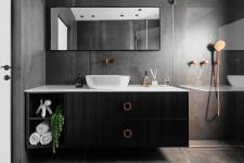The desire to create a sophisticated, powerful, and precise design led Michaeli to source all the tiles and sanitaryware from the boutique store ‘Topaz Ceramics’: “The store imports very unique products, proper pieces, which allowed us to create a high-end quality property. For example, the tiles chosen for the floor are granulated gray in a special finish that has a cloudy yet glossy effect”, Michaeli explains. “This is an eclectic-urban textured tile on the one hand, and on the other, the cloudy gloss gives it a clean and luxurious feel in the space”.