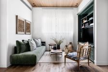 The mezzanine level, where the family corner, the children’s rooms and the guest suite are located, serves as a central strategic axis, overlooking the different parts of the house and enabling continuous eye contact between the family members. In the center of the family corner, which serves as a meeting place, are a green wooden piece of furniture, small tables on a soft carpet and velvet soft furnishings. The children’s rooms were designed according to their taste in delicate color scales and relaxing pastel hues. A light wood wall covering, matching carpentry, delicate pieces of furniture and soft art were planned for each of them. A communication closet was planned between two of the rooms, which the designer chose to cover with light-colored slats that blend in with the wall and create an interlude from the pastel colorfulness in the children’s rooms. The washroom was designed in a monotone pallet of black and white and is also an island of quiet compared to the colorfulness that rules in the other parts of this story. The guest suite contains a spacious well-lit bedroom in the center of which is an accent wall covered with raffia wallpaper in a chevron pattern. Elements such as furniture and textiles in aqua, blue and gray hues give it its hotel appearance.