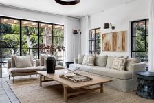 Minimalistic aluminum window frames were installed in the openings throughout the house, divided into squares that unite and combine the modern and rural styles. Natural Israeli stone covers the facades of the entrance story and the children’s story and penetrates inside as an accent wall in the living room spread over 7 meters. On the wall are black minimalistic bookshelves surrounding a powerful bay window that looks out over the cared-for garden and orchard. This raw, crude impressive item meets a dark bluestone floor. The color scale is linen and the soft materiality in the living room that Niv-Toledano has chosen is based on velvets, natural fabrics and soft flowing drapes. In the center of the space is an artistically carved oak table, placed on a straw mat. The impressive accent wall is lit from above by a linear light fitting made of a brass pipe and ceramic spotlights.