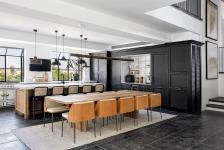 The spacious kitchen is also planned with perfect symmetry. Two bay windows fill the space with natural light and enable a wonderful view of the garden. Niv-Toledano planned 3 parallel strip lights next to a high black oak facade, containing a niche faced in Carrera stone with a set of brass display shelves for a coffee machine. The other facades are made of natural oak, on which Carrera stone work surfaces with an inlaid brass detail have been installed. Each function has been defined by decorative lighting, so that for example a linear brass lighting pipe floating above the dining area creates quiet and defines the area. An ensemble of five brass light fittings with a raw appearance and a flowing composition has been installed above the island.