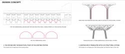 The entire design is evolved from a traditional arch, derived from the pre-existing station itself. Each terminal is composed of arches spanning the openings by the means of separate units assembled into an upward curve to maintain their structural integrity. The individual arch and vault shape is extracted in shape and scale from the existing station, so as to create a harmonious extension of the terminal.