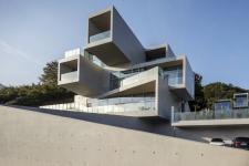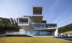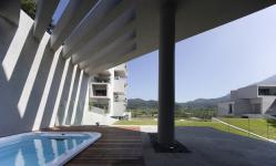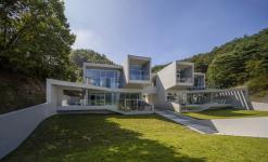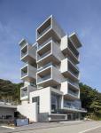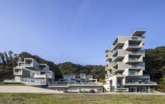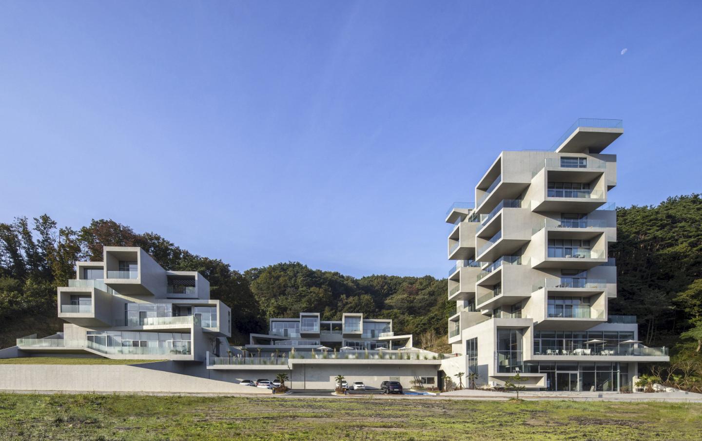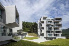 The main building is placed adjacent to the road for the convenience of the guests, and the environment of a golf course during day and night is taken as the main viewpoint by leading eyes to the golf resort on the east side. Two units with a cantilevered balcony are staggered on each floor to secure privacy and formative changes for individual units.