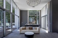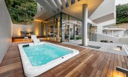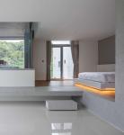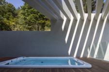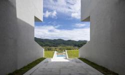 An artificial hill is placed on top of the performance hall to avoid visual collisions between the road and the inside of the complex and to focus on a view of Mt. Naejangsan. Each unit has a split-level floor in consideration of the slope, and the sensitive height difference is used for private swimming pools and wooden porches.