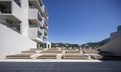 The main building and building A, B, and C are arranged around a common yard in consideration of the site conditions which is sloping to the north and the view of the complex. Created at a level of 3.8m from the road, the common yard is planned to be linked with a swimming pool and performance program.