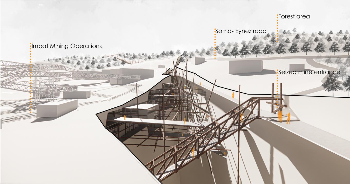 In addition to the constructed spaces, a memory route is added in front of and behind the spaces so that the destruction caused by the mines is never forgotten. And this memory route; sometimes by using the transitions on the platforms where the spaces are located, it connects with each other and sometimes with the facing cavities. After the spatializations were completed, the first closed road was redesigned along and parallel to the slit in order to make the actuality produced here more visible. In this way, users sometimes have to face the facts while driving straight on the road and sometimes while crossing bridges. In addition to this; The walking path created in the forest from Eğnez to Soma, sometimes parallel to the crevice and sometimes passing over it, reaches the door opening from the mines to nature. In this way, he joins the order of the building through a dramatic way and reveals the duality as a whole.