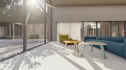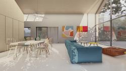 The house is designed in wooden CLT technology, which limits significantly CO2 emissions. Wooden shutters regulate the flow of daylight. Sofas covered with recycled materials. The use of a heat pump is also an innovative and eco-friendly solution to heat the interior of the home and water by using external air and electricity. What's more, it also allows room cooling in warmer days. This significantly reduces energy bills and carbon footprint. Electricity will flow from an unexhausted source, the sun, through the installation of a photovoltaic.