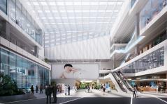 The atrium extends eastwards to the urban greenery, seamlessly connecting itself with the landscape axis at the east entrance. Staff can enjoy a tranquil urban oasis on the south whereas a piazza on the west is created through retreating for large-scale events.