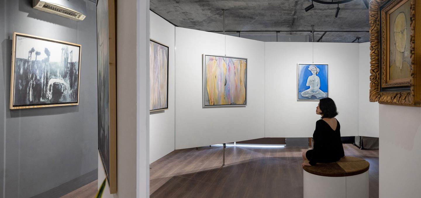 A 60-square-meter artist private gallery and studio has been recently transformed from a two-bedroom apartment located in a conventional high-rise building. The client is Trịnh Cung, a famous old painter who decided to return to his homeland after many years living abroad. The proposed design is based on three fundamental concepts.