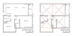 After removing existing partitions and furniture, the overall floor plan is revealed as a perfect square of 7-meter x 7-meter with three small rectangles at the edges which are provided with sufficient daylight. An underlying geometric order was initially realized: the big square is divided into four smaller ones, three of them are dedicated for the main gallery space while the kitchen and bathroom occupy the fourth one. The diagonal lines of the squares imply for the conceptual layout of the gallery partitions, which are parts of the whole geometric order. Meanwhile, the three small rectangles can be used for a variety of other necessary activities such as painting, meeting, relaxing and resting.