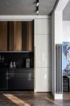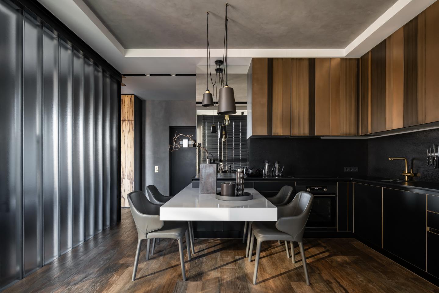 Metal and glass contrast with warm materials. The honey shade of the porcelain floor harmonizes with the copper panels of the kitchen facades, the micro-cement on the walls and ceiling has a pleasant roughness. In contrast to the black metal, we chose a warm and soft olive veneer, against the background of dark tones, it seems to glow from the inside. Designer accessories and electrics from favorite factories Fontini and Buster&Punch added a bold refinement.