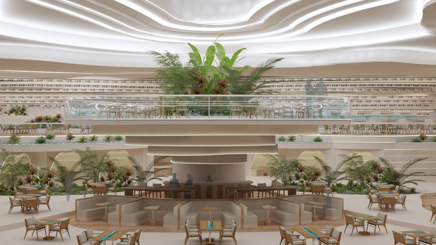 This zone consists of Library Café Where people can read while having drinks or eat, and a restaurant. This Zone height is 11 meters, 5 meters of them are under the sea level the sea acts as a natural aquarium for the guests and 6 meters start at the sea level which shows the mountains and sky. It achieves the design goal by merging the indoor with the outdoor.