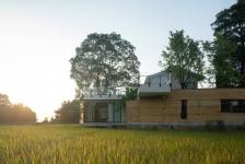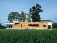 A corner of the study breaks through the rammed earth wall and passes into the rice field, floating on the green color. The design of the corner is “None”, without any shelter and frame, and the pillars are hidden on both sides. After the French windows were closed, a pastoral landscape painting was framed on the roof and floor.