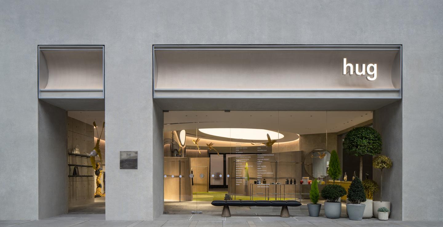 Into it, natural images are deconstructed and transmitted through material combination. Concrete, steel bar and light are integrated here to break the inherent pattern of space. Starting from the audiences'sense of body, the space atmosphere is created and the comfortable and comfortable field signal is transmitted to the entrants. The visual perception is carried through the combination of soft outfit selection and color matching which conform to brand taste and style tone. It is spread vertically in the annular space from the outside to the inside to convey the familiar and surprising viewing experience belonging to Hug.