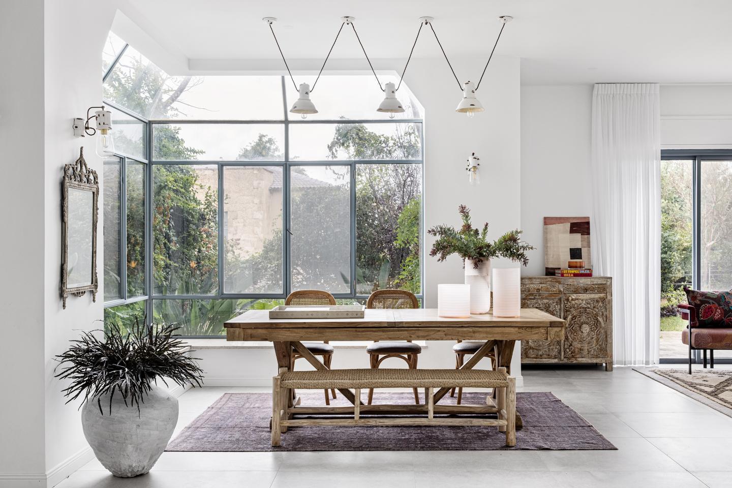 The public space is open and enables wide or intimate hospitality, the living room contains a sofa and two armchairs with European fabrics, next to a console table on which artworks and design books are displayed. There is an ethnic Kilim rug, and drapes that give a soft, delicate touch. The dining corner has a vintage carpet in deep purple hues, and wooden furniture. The public space “sits” on an L-shaped set of windows that allow the garden to penetrate the house clearly.