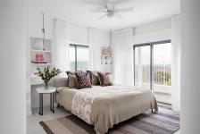 The master suite contains a washroom, a storage area and a gym. An exit from the suite to a balcony with a charming view adds to the feeling of calm in the space. Niv-Toledano explains that “the idea was to create a quiet space. Something even meditative.” As far as design is concerned, apart from the carpet, everything is “colored” with soft, pleasant pastel touches. The parents’ washroom contains a pleasant lilac closet and the children’s washroom is a delicate light blue.