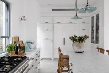The house is surrounded by green, natural woodland, a proportionate, unassuming Israeli house dominated by white hues with pastel touches that are introduced gently and pleasantly in light fittings, woodwork, wet rooms and accessories.