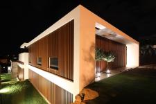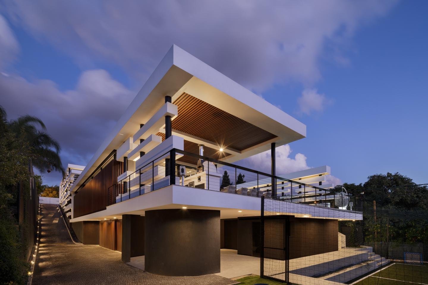 In an aerial photograph, the house covers a large area of the slope but when seen from the front, it blends into the local landscape. From the street front, it looks like a minimalistic single-story building, and in effect it develops and interacts with the topography. Upon entering the plot, a visitor descends along the building side towards the entrance story, which is a mezzanine story. From there, one ascends to the master bedroom story, above which is another level containing the children’s bedrooms. From the mezzanine one may descend to the garage level and more.