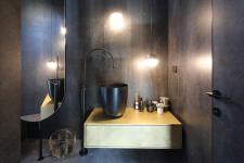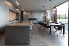 The floor is clad with extra-large tiles of a dark concrete hue. The walls were painted with a cloudy concrete effect that gives the space an elegant, prestigious and coherent appearance. The house’s kitchen is particularly large, covering not less than 60 m2. At its center, the architects designed a large island that is approximately 7 meters long, with a work surface and surrounding sides of stainless steel that are tailor made for it, and brought in as a single homogeneous unit directly from the manufacturing plant in the Netherlands. The electrical appliances have the high quality Fulgor Milano brand (imported to Israel by the electricity division of Birman Trees and Hardware Company), providing an optimal solution for the homeowners’ love of hosting and cooking. The work surface on the island is centered by openings according to plan for an i-Cooking induction stove, an opening for a vent hood over the surface and built-in electricity outlets.