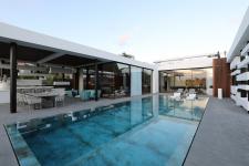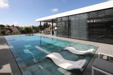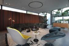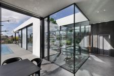 Upon entering the impressive foyer, the public space becomes visible. It is centered by two inner yards framed with glass cubes, divided by reflection pools centered by an ornamental tree. The two form an exciting transition to the living room, and to their left are the kitchen, dining corner and the pool that is visible from any angle on the level.