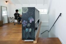 A staircase leads to the top level where the design theme continues. The original staircase was preserved and renewed with a unique light iron partition that partly conceals it from the central space, whilst simultaneously creating a sense of spaciousness. The black iron partition is designed in delicate lines that do not overwhelm the space.