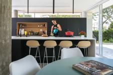 An exit to the small garden was fitted next to the library. The lush green garden, with a fountain in its center, has turned into an integral part of the family corner and adds a sense of openness to the space. The open kitchen is located to the left of the entrance and enjoys natural daylight thanks to a long window, preserved from the original planning. The kitchen is made of wooden black cabinets with a white Corian island in the center.