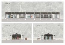 In the southern corner of the property, there is a home for orphans and the caretaker's farm family, and then a repaired "larger" existing building, which serves as a tool store, a sanitary facilities facility, and an insaka social meeting space, typical of the local culture. The "smaller" existing building is recycled as a source of material due to its location on the plot and its poor condition. The main architectural design is the main building for living in the form of a longitudinal dome with a gable roof, which together covers the housing of the administrator, orphans, technical facilities and warehouses. The center of the dome is a veranda for multifunctional use, together with a drawing board wall. The entire structure is raised above ground level for protection from the elements and also offers seating around the perimeter.