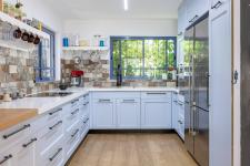 “The old kitchen was completely gutted, and, in its place, we fitted a brand-new kitchen unit”, explains Arch. Snir. “We knocked down the wall separating the kitchen from the lounge, creating optimal flow between the areas”. The kitchen brings a modern take on rustic, thanks to the fresh use of a pastel color scheme.