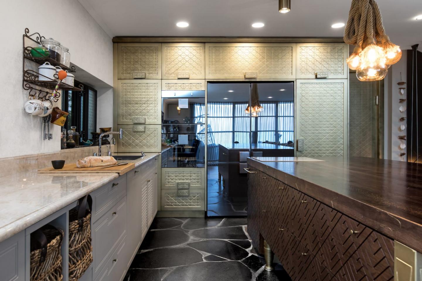 The lower cupboards where you will find the kitchen sink and the clean marble משטח are colored in light grey, and in the center of the kitchen the wooden kitchen-island stands showing off its different pattern on each side.