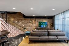 The living room was designed to the minimum use of materials and furniture’s in order not to create a design- load as the tall brick wall facing you while watching the TV or just sit on the couch having a mice conversation .