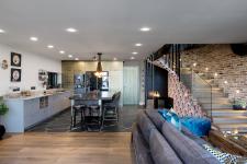 The second-floor motive is the basalt stone in different cutting shapes - the hallway, balcony and the kitchen floor are covered in fishbone cut basalt whereas the living room area floor is cut into sections.