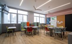 In the classrooms, teaching is encouraged not to be frontal, but 360°, using support elements such as mobile bulletin boards and corks, as well as storage furniture that is also mobile. Wood-type vinyl floors were installed on the floors to achieve greater warmth of the space and noise absorption. The color palette changes depending on the type of classroom and more versatile furniture that will encourage teamwork was also considered.