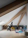 Top floor is a loft, original triangular roof structure kept, and through symmetrical open skylights, blocks and floors create a self-contained scale. Wide use of simple and plain materials such as wood and glass create a tranquil and relaxed atmosphere. The clean lines of the space fully demonstrate the oriental beauty, which outlines the look of life.