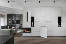 The elegant and impressive look of the new apartment is revealed once you enter it. The multi-layer parquet floor, which was imported from Belgium, is made of old-fashioned oak, and to the right of the entrance door an impressive 5-meter-long power wall is revealed, which accompanies the entrance and wraps around the corridor connecting the public space with the private wing: "Since this is an active family with 3 small children, Storage became extremely important. We designed a particularly aesthetic whole hinge for them with touch-opened doors in an asymmetrical composition, with plenty of storage space. This wall cabinet, made by a craftsman carpenter, does not reveal even the slightest bit what is going on inside. The doors were painted in an oven and look Like tiles of varying sizes, the opaque mass is broken by two black iron niches in which we integrated beautiful utensils. In the connection between the two fronts we integrated a fireplace that adds a warm and homely dimension. The cabinet also contains the electrical cabinet and the communication cabinet, so the space remains clean and devoid of visible systems".