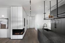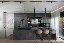 Above the kitchen island, Kazayoff planned an element made of black iron that serves as a storage addition and as an aesthetic motif that emphasizes the height of the space: "By CNC cutting the bottom of the device, wine glasses can be hung upside down and even when a few glasses are hanging from it, when you look at it from the bottom up, the bar remains elegant and impressive."