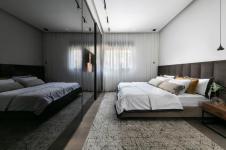 The parents' master bedroom is also particularly pampering. Kazayoff designed for the couple a wall-to-wall closet with plenty of storage space, with black glass fronts with a built-in TV integrated into the plane of the closet door. The front that separates the bedroom from the bathroom holds a surprise: "This is actually the wall that separates the guest toilet from the master bedroom, so I used this part for a 30 cm deep shoe cabinet that is covered with a body mirror and looks like an integral part of the front of the bathroom. Instead of creating a built wall that would differentiate between the functions, I chose to work with a Belgian profile in which I inserted Master-Line glass that obscures the figure and allows intimacy. In the bathroom, the couple enjoys an extra-large bath cabinet, covered with oak veneer, and surrounded by LED lighting and an extra-large shower with a built-in niche for shampoo and soaps. I covered the walls with black porcelain granite tiles from floor to ceiling, with a pattern of fine gray veins."