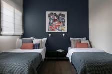Like many of twin pairs, the couple's 7-year-old sons also chose to join forces and asked for a shared room. "Their bedroom is not a classic children's room and is mainly used for sleeping. They have a dedicated play area in the yard and a well-equipped family corner on the lower level. In the family room, I planned a designated area for them for a large desk, for them to study in. That way we have enough room for two large beds and an extra-large wall closet. For the wall I chose a blue color that is suitable for a wide range of ages, thinking that it will remain relevant for years to come. I covered the walls of the adjoining bathroom with tiles in three shades of blue that create a dynamic and youthful look."
