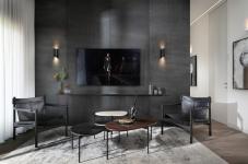 From the kitchen to the living room: the designer created the power wall in the center using wooden panels painted in a metallic black shade: "The apartment is relatively high (3.4 m) and if I had chosen iron panels, we would have had to use several separate panels and make connections between them. To maintain the continuous clean look, I chose to use wooden slats that allowed me to rise from the floor to the height of the ceiling. Underneath the TV screen is a shelf made of thin metal and on both sides of it lights that flood the wall with dramatic lighting. In general, in the public space I chose to work with quite a few items that emphasize the good proportions of the space, so for example, the linear lighting strips that are embedded in the ceiling and emphasize the longitudinal lines of the apartment".