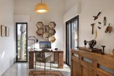 The owner’s grandfather was a shoemaker, and so the designer chose to hang some of his old workshop tools on the home office wall.