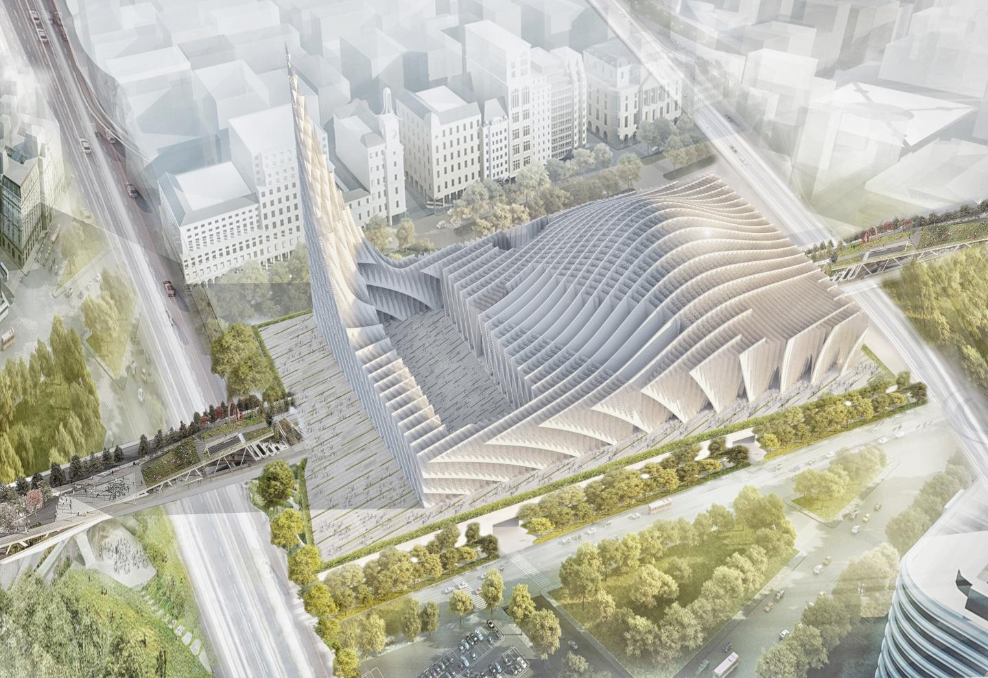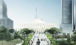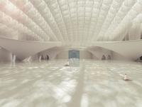 The monumentality and divinity of this Mosque is established through the geometry and form of long spanning ribs of white marble clad concrete structural fins which emerges from the ground and run parallel along the line of holy Mecca and gently twists as it is extruded upwards to face the Creek tower. The surrealistic, parametrically generated dome like roof form falls in the intersection of the city axis and the imaginary line drawn from the site looking towards Mecca. The courtyard in this context is shared between the city as well as the Mosque gesturing social integration and universal acceptance. The extension of the structural fins forms the fourth wall of the courtyard as well as the Minaret. The soaring 100 m high minaret is an expression of liberation generating an upward pull and merges with its surrounding landscape. The rectangle like nature of opening facing the city is highly suggestive that this space is a transitory interface between the city and the Iconic Mosque.