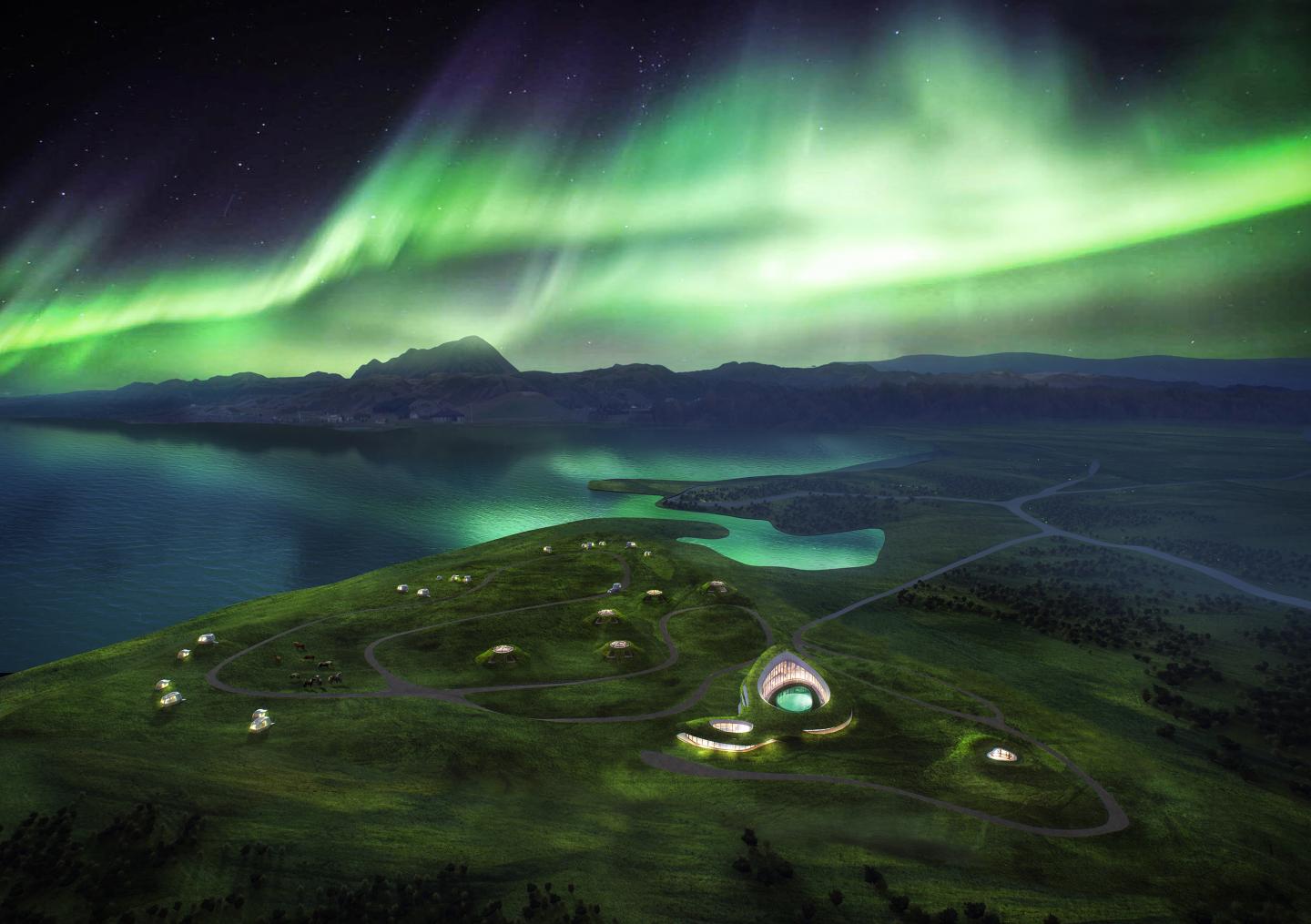 Iceland, a Nordic island nation in the North Atlantic ocean, is home to some of the world's most unique and incredible natural landscapes. Iceland's volcanic region, known as the Land of Fire and Ice, blends seamlessly into vast glaciers and waterfalls; Iceland is also an ideal place to see the northern lights.The project is adjacent to Lake Myvatn, with a vast landscape across the swamp on one side and mountains on the other. The north is the best direction for viewing the Aurora borealis. Inspired by the unique geographical location and natural environment, the design concept of "ice and Fire" is adopted to create a two-way link between architecture and natural ecology and achieve harmonious coexistence between human and nature.