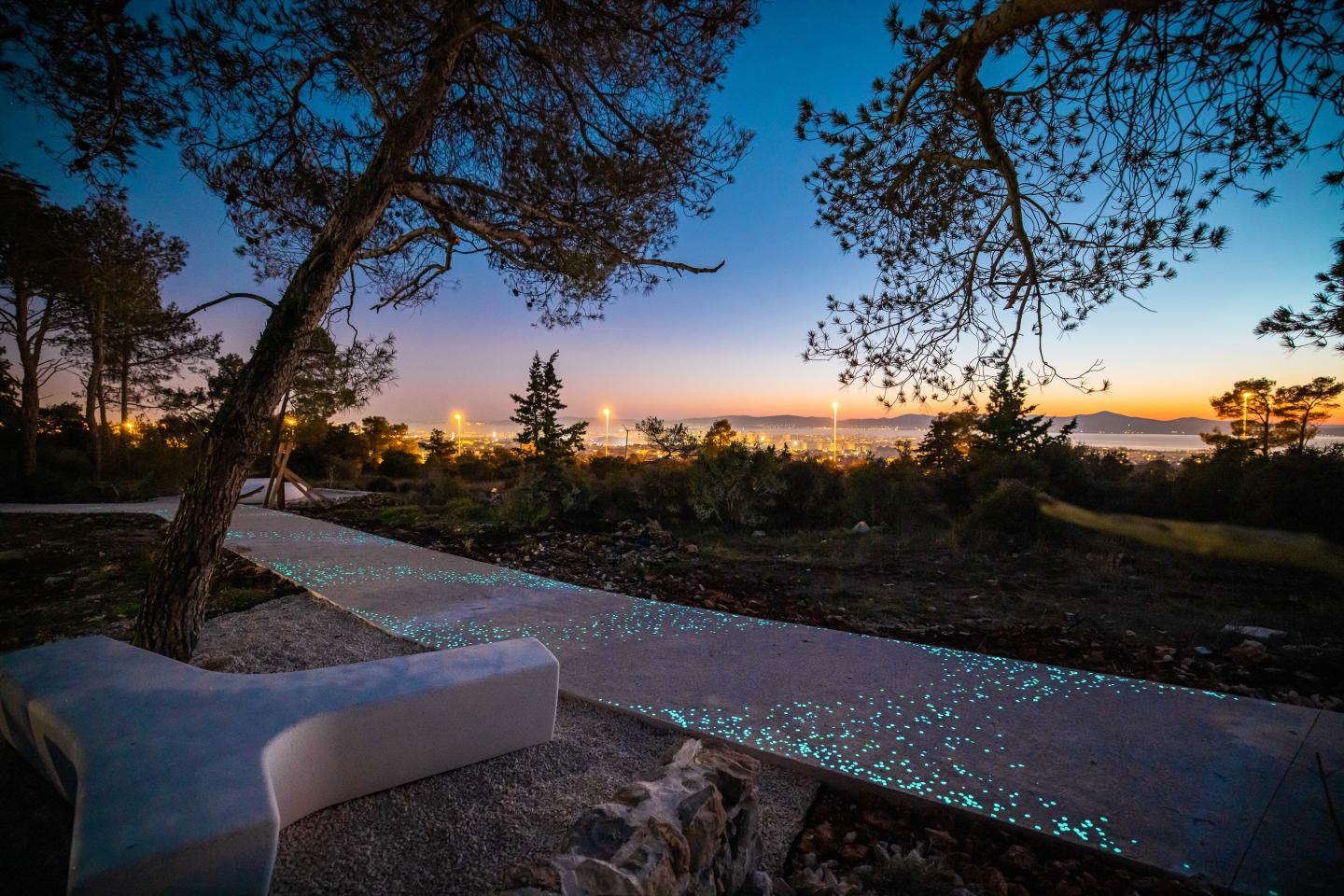 With this, intense lighting and light pollution were avoided. The illuminated path at night does not compete with city sights and provides enough light that accumulates during the day to guide visitors at night.