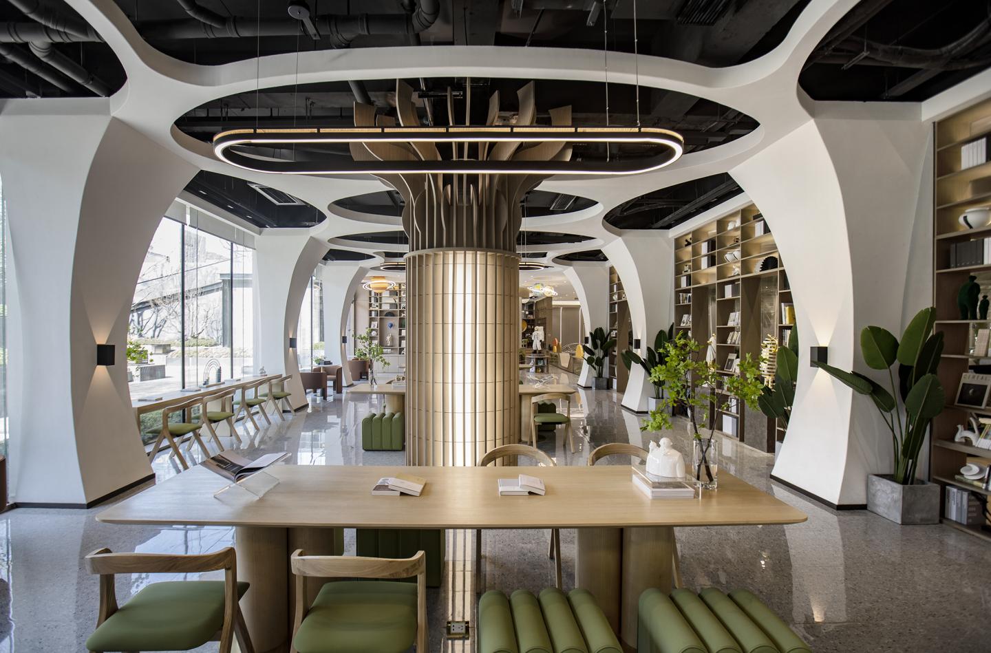 The design of several functions has made the different levels of segregation and the limit as far as possible is the space is open and has its characteristics. Make it won't interfere with each other made five children reading areas on the ground step and placed cushions; Children can sit here and read and play activity center with large glass, has a splendid visual effect. Large bookshelves display massive books for the community to read, and bookshelves also serve as a partition between the reading area and the fitness area. Artificial landscapes are set up in the fitness and yoga areas to allow people to relax during exercise. The interaction between parents and children considers the overall design. The large zone of the reading area adopts the exposed design, through the whole space is strung together by the circular framework and curve design.