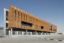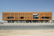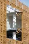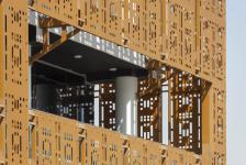To shield the building from the harsh sun on the southern facade, a skin of perforated panels is provided, which is directly inspired from Arabic Mashrabias and Indian Jalis.