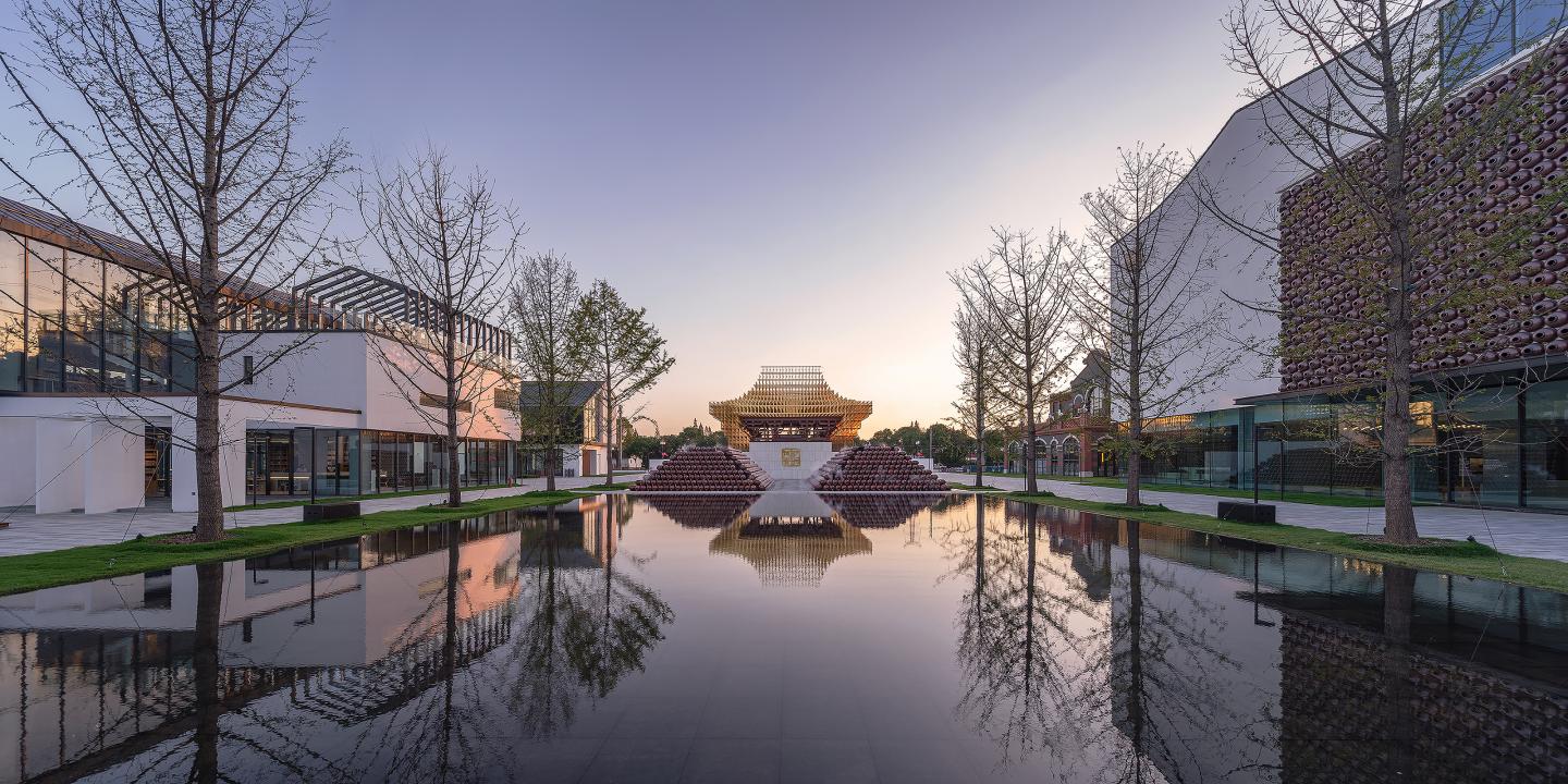The project is located on Houcheng Street, a plot that is adjacent to the existing Shazhou Youhuang factory complex. The new layout includes facilities that are actively serving the existing production while becoming a landmark to the city. An industrial tourism destination with a unique style, a leisurely environment, based on a mix of Jiangnan architectural elements and the modern Chinese architectural abstractions. This vision is skillfully articulated in the project’s entrance pavilion, a profound statement of the bright and ever changing future built upon centuries of tradition.