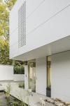 The snow-white Corian facade contrasts with the surrounding allotment houses, some of which are cheerfully colorful, in a winking manner. At the same time, the smooth, white acrylic stone acts as a projection surface for the shadow play of the surrounding trees.