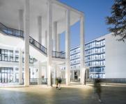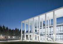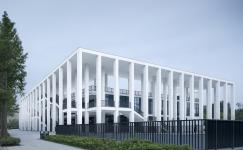 The design tried to coordinate the canteen’s facade with the existing buildings on the campus. Vertical lines specially applied to the facade convey an elegant and easeful atmosphere along with the white textured coatings. Besides, squares on the east and south sides of the canteen were mainly paved with rigid materials, which provide open spaces for students’ outdoor activities. Moreover, arrays of trees partially dotting the squares can serve as shades.
