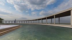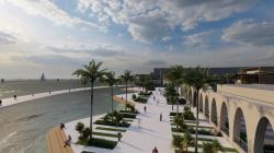 From the shoreline, the Civilization Path appears as a disc-shaped in a wedge shape, The civilization path was intended to be in a form of pure geometry of the circular plan to "recall the cyclical nature of knowledge, fluid throughout time" and to reflect the circular loop of civilization as we are being affected by civilization and always affecting civilization. the Touristic Port exerts a commanding, primeval presence over the harbor city.