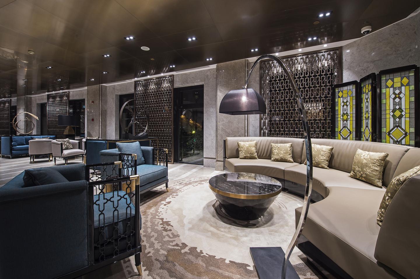 Although the negotiation area is concise, there are still some glimpses of the graceful and gorgeous flavor. These three sets of negotiation tables and chairs are specially made of high-grade fabrics and leather materials, with partial metal decoration. This uniquely warm and comfortable feel of leather adds a sense of intimacy. In addition, the customized furniture and lamps with polished patterns and metal decoration look modern and gorgeous. Between each group is placed a sofa back a few, back a few on the iron sculpture is also carefully selected. These walls and façade are made of natural marble with partial wood veneer and Chinese decorative patterns. The overall space is made of marble, iron, leather, silver foil, and stainless steel, emphasizing the simple texture and clean and sharp layout. It perfectly expresses the exquisite dignity and luxury of ART DECO.